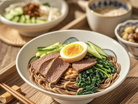组合:·龙大美食酱香牛肉(100g,切片加热)·荞麦面/魔芋面(50g煮熟,过冷水)·焯水菠菜+黄瓜丝(增加膳食纤维)·溏心蛋(1个,补充优质脂肪)调味:牛肉酱汁+少许蒜末+香醋特点:·蛋白质≈30g,碳水可控,健康高蛋白,适合中国胃。·魔芋面/荞麦面几乎零卡,适合严格控卡人群。