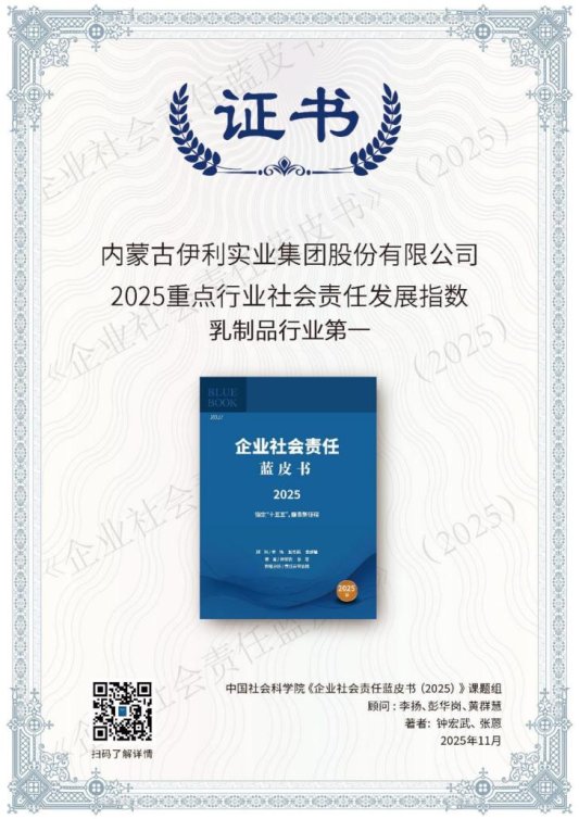 伊利集团获评中国社科院《企业社会责任蓝皮书(2025)》乳制品行业社会责任发展指数第一,这也是伊利连续第8年摘得此桂冠。