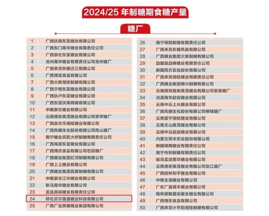 呼伦贝尔安琪晟通糖业科技有限公司以11 3万吨的产糖量,位列全国糖厂第24位、甜菜糖厂首位。